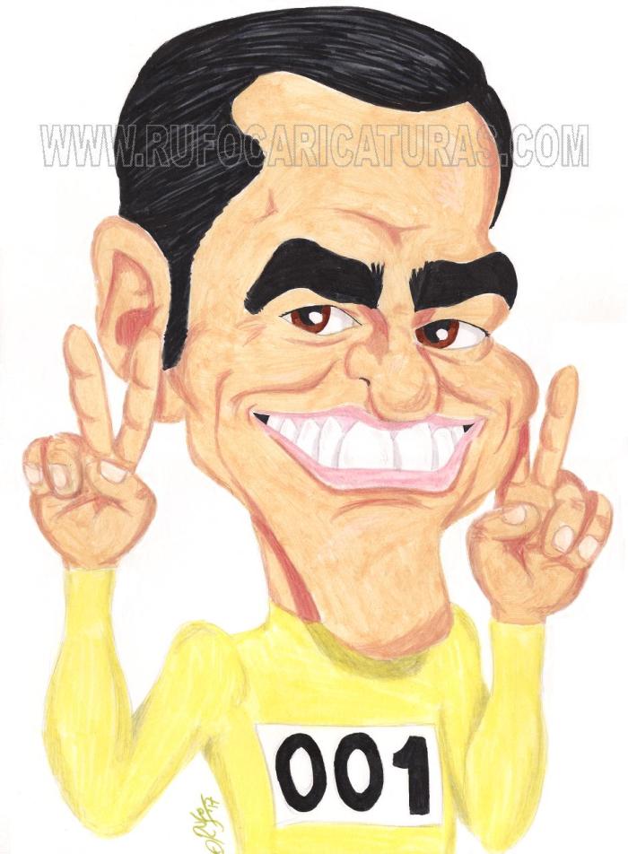 Caricatura del ciclista Alberto Contador. Acrílicos y rotuladores. El original de 30×40 cm está a la venta por 100 €.También disponibles reproducciones tamaño póster (30x40cm, 5€) y mini-prints (10x15cm, 3€) Info: rufocaricaturas@gmail.com