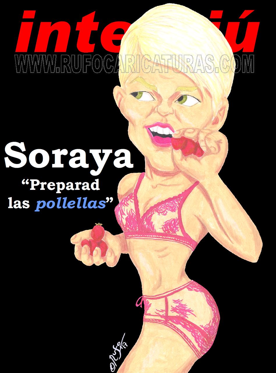 Caricatura de la cantante Soraya Arnelas versionando su portada en la revista Interviú. Acrílicos y rotuladores. El original de 30×40 cm está a la venta por 100 €.También disponibles reproducciones tamaño póster (30x40cm, 5€) y mini-prints (10x15cm, 3€) Info: rufocaricaturas@gmail.com