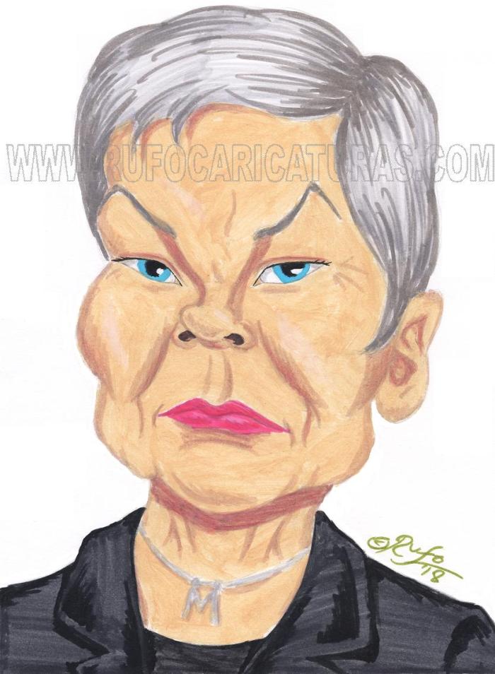 Caricatura de la actriz Judi Dench. Acrílicos y rotuladores. El original de 20×30 cm está a la venta por 50 €.También disponibles reproducciones tamaño póster (30x40cm, 5€) y mini-prints (10x15cm, 3€) Info: rufocaricaturas@gmail.com