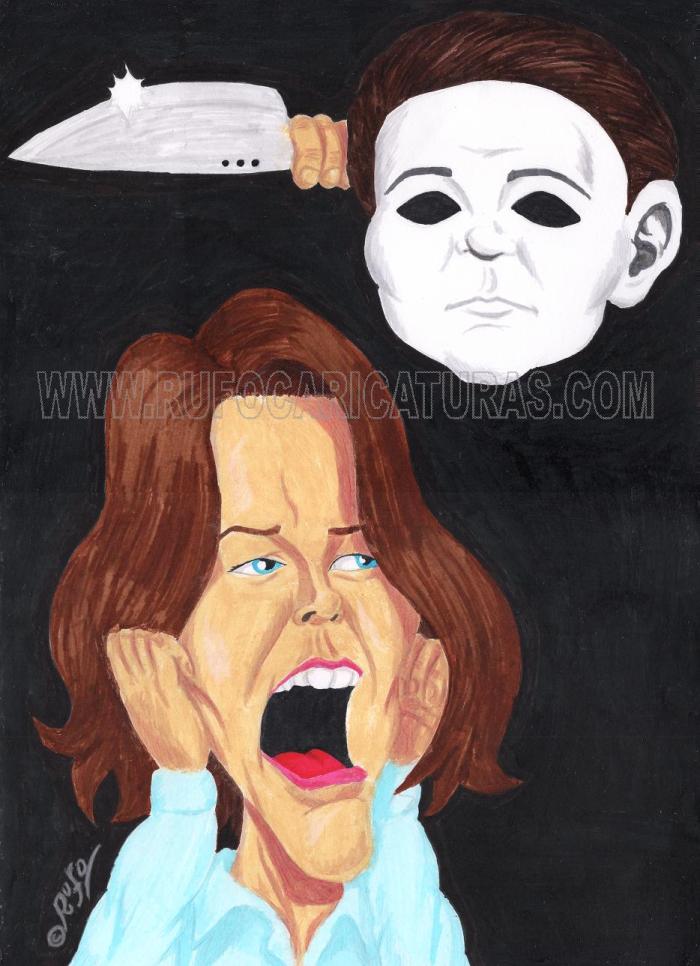 Caricatura de la película La noche de Halloween. Acrílicos y rotuladores. El original de 30×40 cm está a la venta por 120 €.También disponibles reproducciones tamaño póster (30x40cm, 5€) y mini-prints (10x15cm, 3€) Info: rufocaricaturas@gmail.com