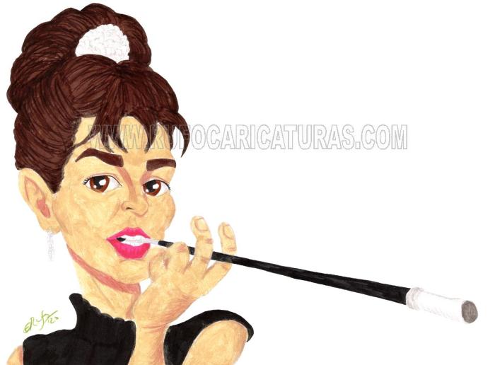 Caricatura de la película Desayuno con diamantes. Acrílicos y rotuladores. El original de 30×40 cm está a la venta por 100 €.También disponibles reproducciones tamaño póster (30x40cm, 5€) y mini-prints (10x15cm, 3€) Info: rufocaricaturas@gmail.com