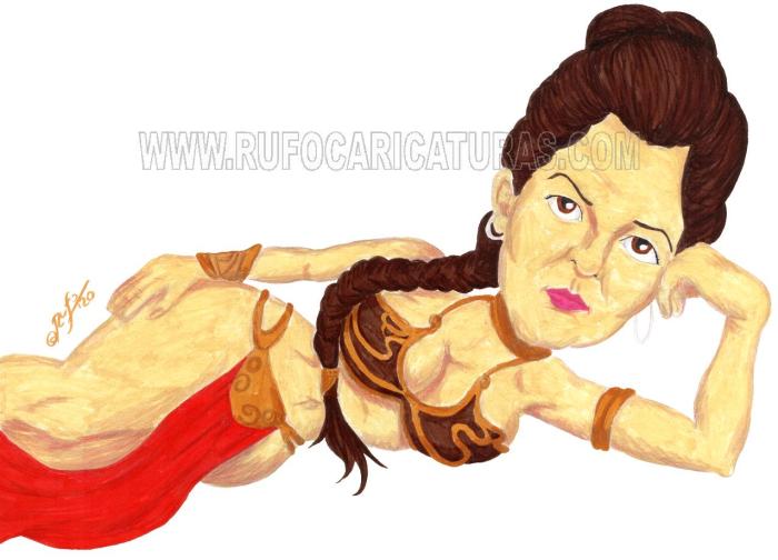 Caricatura de Carrie Fisher como Leia Organa con el bikini de El retorno del Jedi. Acrílicos y rotuladores. El original de 30×40 cm está a la venta por 100 €.También disponibles reproducciones tamaño póster (30x40cm, 5€) y mini-prints (10x15cm, 3€) Info: rufocaricaturas@gmail.com