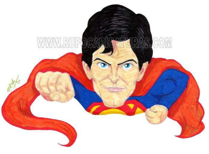Caricatura de Christopher Reeve como Superman. Acrílicos y rotuladores. El original de 30×40 cm está a la venta por 100 €.También disponibles reproducciones tamaño póster (30x40cm, 5€) y mini-prints (10x15cm, 3€) Info: rufocaricaturas@gmail.com