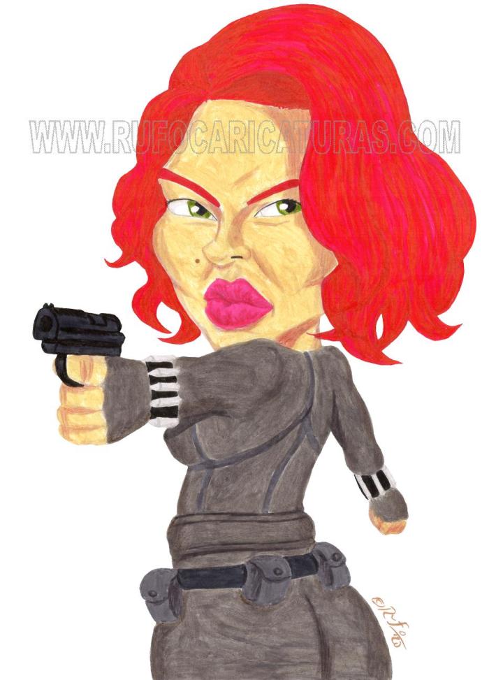 Caricatura de Scarlett Johansson como la viuda negra. Acrílicos y rotuladores. El original de 30×40 cm está a la venta por 100 €.También disponibles reproducciones tamaño póster (30x40cm, 5€) y mini-prints (10x15cm, 3€) Info: rufocaricaturas@gmail.com