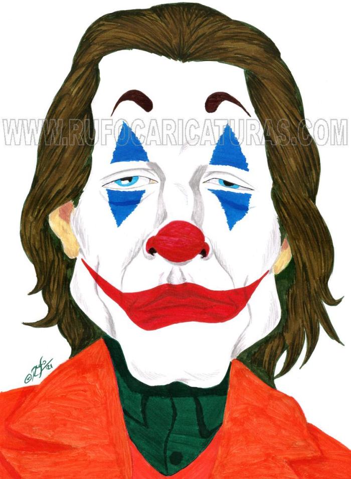 Caricatura de Joaquin Phoenix como Joker. Acrílicos y rotuladores. El original de 30×40 cm está a la venta por 100 €.También disponibles reproducciones tamaño póster (30x40cm, 5€) y mini-prints (10x15cm, 3€) Info: rufocaricaturas@gmail.com