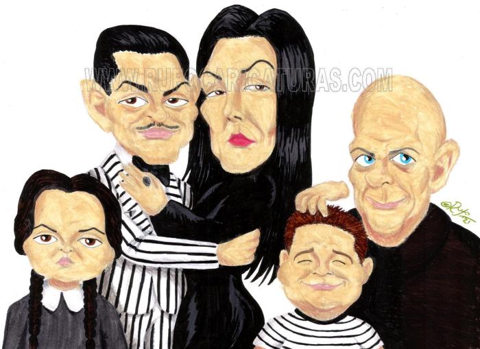 Caricatura de La familia Addams. Acrílicos y rotuladores. El original de 30×40 cm está a la venta por 180 €.También disponibles reproducciones tamaño póster (30x40cm, 5€) y mini-prints (10x15cm, 3€) Info: rufocaricaturas@gmail.com