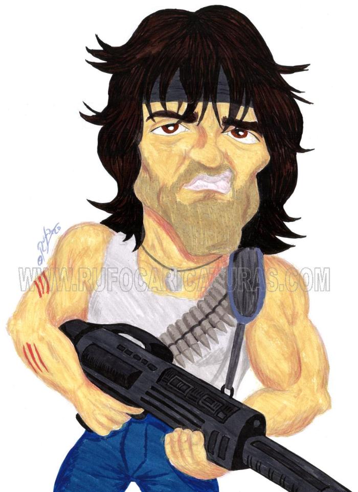 Caricatura de Sylvester Stallone como Rambo. Acrílicos y rotuladores. El original de 30×40 cm está a la venta por 100 €.También disponibles reproducciones tamaño póster (30x40cm, 5€) y mini-prints (10x15cm, 3€) Info: rufocaricaturas@gmail.com
