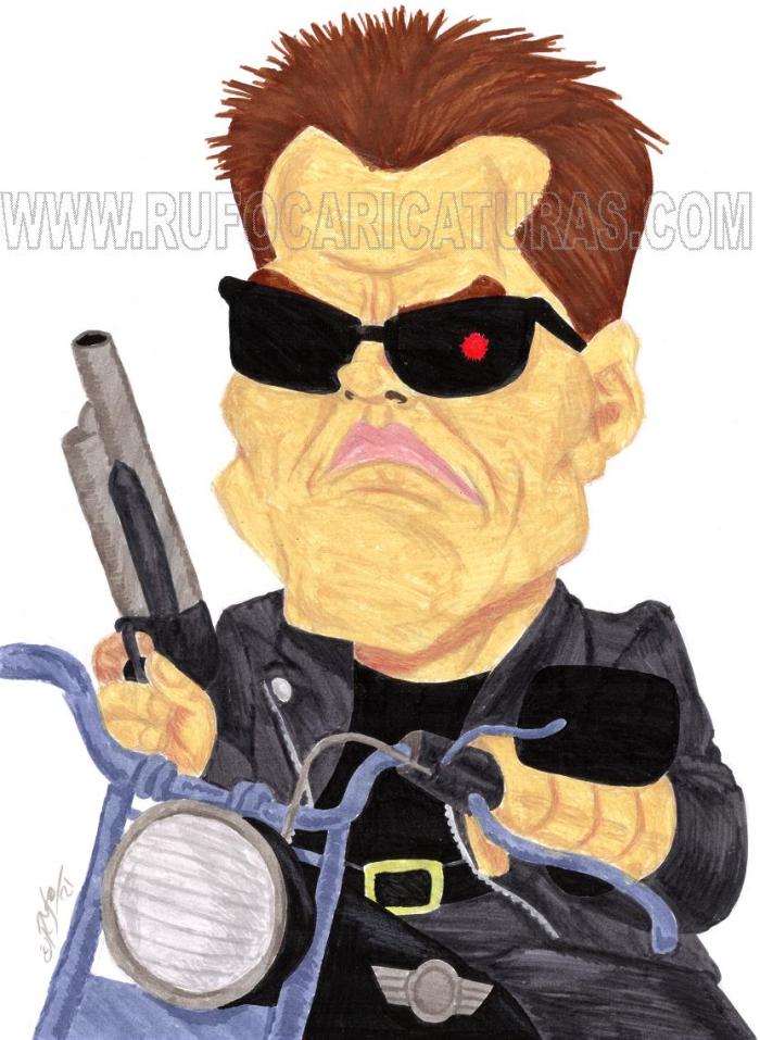 Caricatura de Arnold Schwarzenegger como Terminator. Acrílicos y rotuladores. El original de 30×40 cm está a la venta por 100 €.También disponibles reproducciones tamaño póster (30x40cm, 5€) y mini-prints (10x15cm, 3€) Info: rufocaricaturas@gmail.com