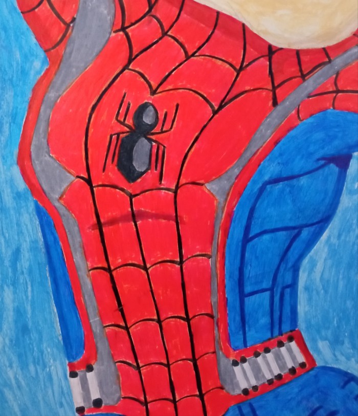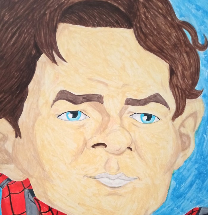 Caricatura gigante de Tom Holland como Spider-man. Original de 70×100 cm pintado sobre cartón-pluma de 2mm de grosor.
