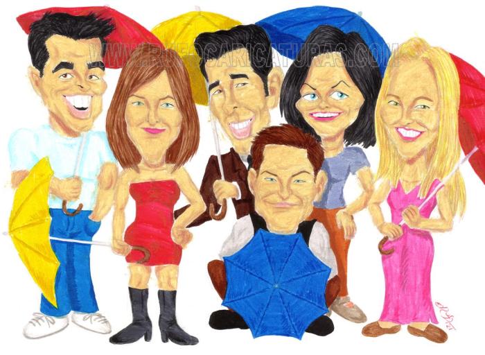 Caricatura de la serie Friends. Acrílicos y rotuladores. El original de 30×40 cm está a la venta por 200 €.También disponibles reproducciones tamaño póster (30x40cm, 5€) y mini-prints (10x15cm, 3€) Info: rufocaricaturas@gmail.com