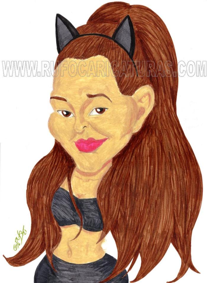 Caricatura de la cantante Ariana Grande. Acrílicos y rotuladores. El original de 30×40 cm está a la venta por 100 €.También disponibles reproducciones tamaño póster (30x40cm, 5€) y mini-prints (10x15cm, 3€) Info: rufocaricaturas@gmail.com
