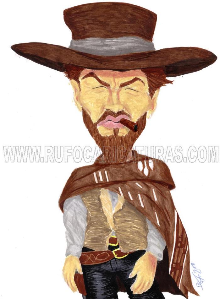 Caricatura del actor Clint Eastwood en la trilogia del dolar. Acrílicos y rotuladores. El original de 30×40 cm está a la venta por 100 €.También disponibles reproducciones tamaño póster (30x40cm, 5€) y mini-prints (10x15cm, 3€) Info: rufocaricaturas@gmail.com