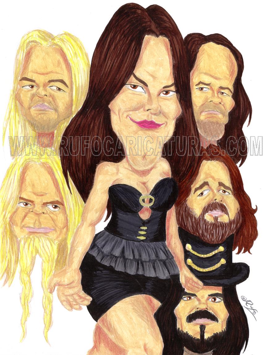 Caricatura del grupo de musica Nightwish. Acrílicos y rotuladores. El original de 20×30 cm está a la venta por 200 €. Info: rufocaricaturas@gmail.com