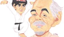 Caricatura de los protagonistas de Karate kid, Noriyuki Pat Morita y Ralph Macchio. Acrílicos y rotuladores. El original de 30×40 cm está a la venta por 120 €.También disponibles reproducciones tamaño póster (30x40cm, 5€) y mini-prints (10x15cm, 3€) Info: rufocaricaturas@gmail.com