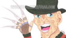 caricatura de Robert Englund como Freddy Krueger en Pesadilla en Elm street. Acrílicos y rotuladores. El original de 30×40 cm está a la venta por 100 €.También disponibles reproducciones tamaño póster (30x40cm, 5€) y mini-prints (10x15cm, 3€) Info: rufocaricaturas@gmail.com