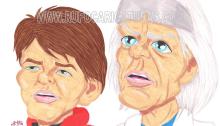 caricatura de los protagonistas de las películas Regreso al futuro: Michael J Fox y Christopher Lloyd. Acrílicos y rotuladores. El original de 30×40 cm está a la venta por 120 €.También disponibles reproducciones tamaño póster (30x40cm, 5€) y mini-prints (10x15cm, 3€) Info: rufocaricaturas@gmail.com