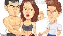 caricatura de los protagonistas de la saga Crepúsculo: Taylor Lautner, Kristen Stewart y Robert Pattinson. Acrílicos y rotuladores. El original de 30×40 cm está a la venta por 140 €.También disponibles reproducciones tamaño póster (30x40cm, 5€) y mini-prints (10x15cm, 3€) Info: rufocaricaturas@gmail.com