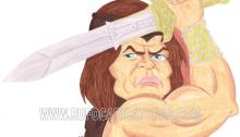 Caricatura de Arnold Schwarzenegger como Conan el bárbaro. Acrílicos y rotuladores. El original de 30×40 cm está a la venta por 100 €.También disponibles reproducciones tamaño póster (30x40cm, 5€) y mini-prints (10x15cm, 3€) Info: rufocaricaturas@gmail.com