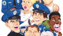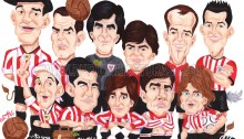 Caricatura de los jugadores míticos del Athletic club de Bilbao. Arriba: Belauste, Zarra, Iribar, Dani, Etxeberria y Aduriz. Abajo: Pichichi, Garay, Txetxu Rojo, Goikoetxea y Guerrero. Acrílicos y rotuladores. El original de 30×40 cm está a la venta por 300 €.También disponibles reproducciones tamaño póster (30x40cm, 5€) y mini-prints (10x15cm, 3€) Info: rufocaricaturas@gmail.com