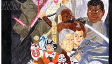 Versión del cartel de la película Star Wars : the Force awakens. Acrílicos y rotuladores. El original de 30×40 cm está a la venta por 300 €.También disponibles reproducciones tamaño póster (30x40cm, 5€) y mini-prints (10x15cm, 3€) Info: rufocaricaturas@gmail.com